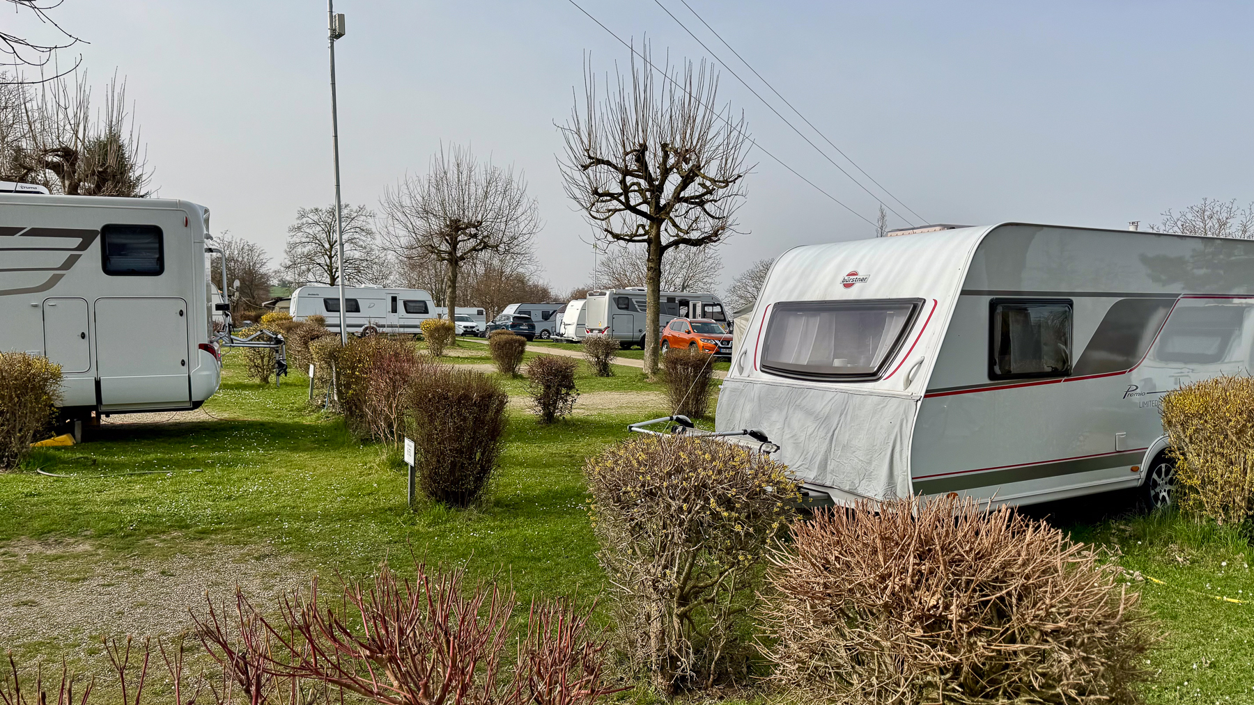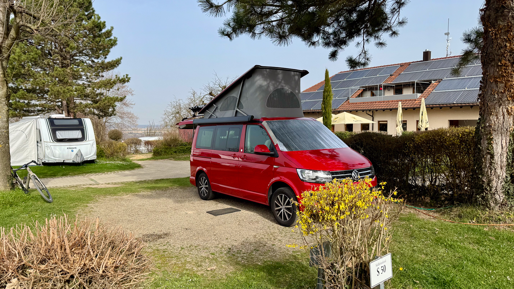 Camping Saisonstart 2026. Das schöne Wetter hält an und auch die Temperaturen sind bereits Vorfrühlingshaft warm. Nur der Saharastaub trübt die Sicht ein bisschen ein. Der schön gelegende Campingplatz Lug ins Land in Bad Bellingen bot eine gute Basis für zwei schöne Graveltouren in der Umgebung. Dabei zeigt sich, dass die Strecken für ein reines Rennrad schon grenzwertig gewesen wären, gab es doch viel Schottel und teilweise auch veritable Offroad Streckenabschnitte. Allerdings hätte man dann auch die Strecke anders gewählt.