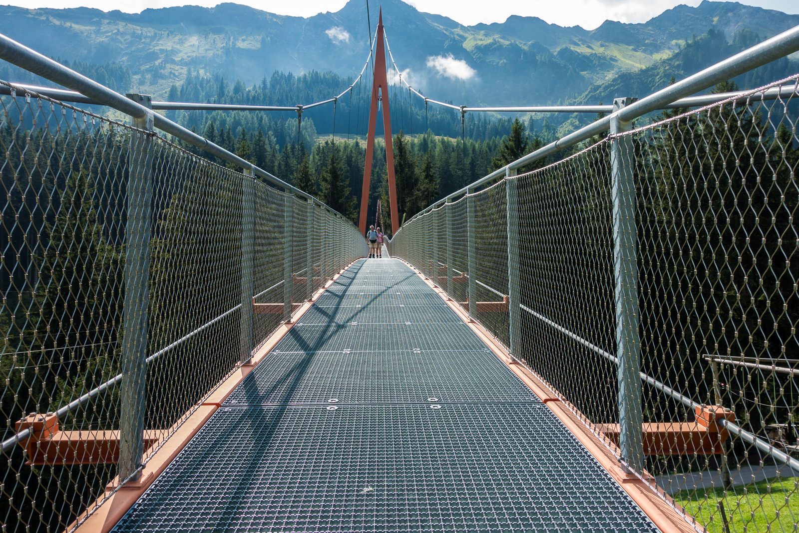 Die Golden Gate Brücke der Alpen ist Bestandteil des 1 km langen Baumzipfelweges. Die Brücke ist 200m lang, bis zu 42m hoch und überspannt den Talschluß am Ursprung der Saalach. Die Überquerung bietet einen atemberaubenden Rundblick auf die umliegende Bergkulisse sowie auf den Hochseilpark, dessen Parcours seitlich und unter der Brücke entlangführen. Aussichtsreicher Mittelpunkt des Baumzipfelweges ist der 600 m lange Wipfelweg. Eine massive Lärchenholzkonstruktion – bis 30 m über dem Waldboden – mit Treppen, Türmen, Plattformen und Brücken. (Auszug Website www.baumzipfelweg.at)