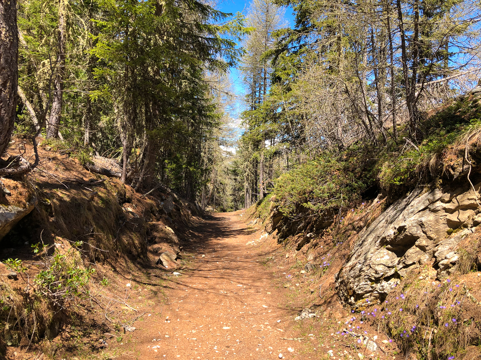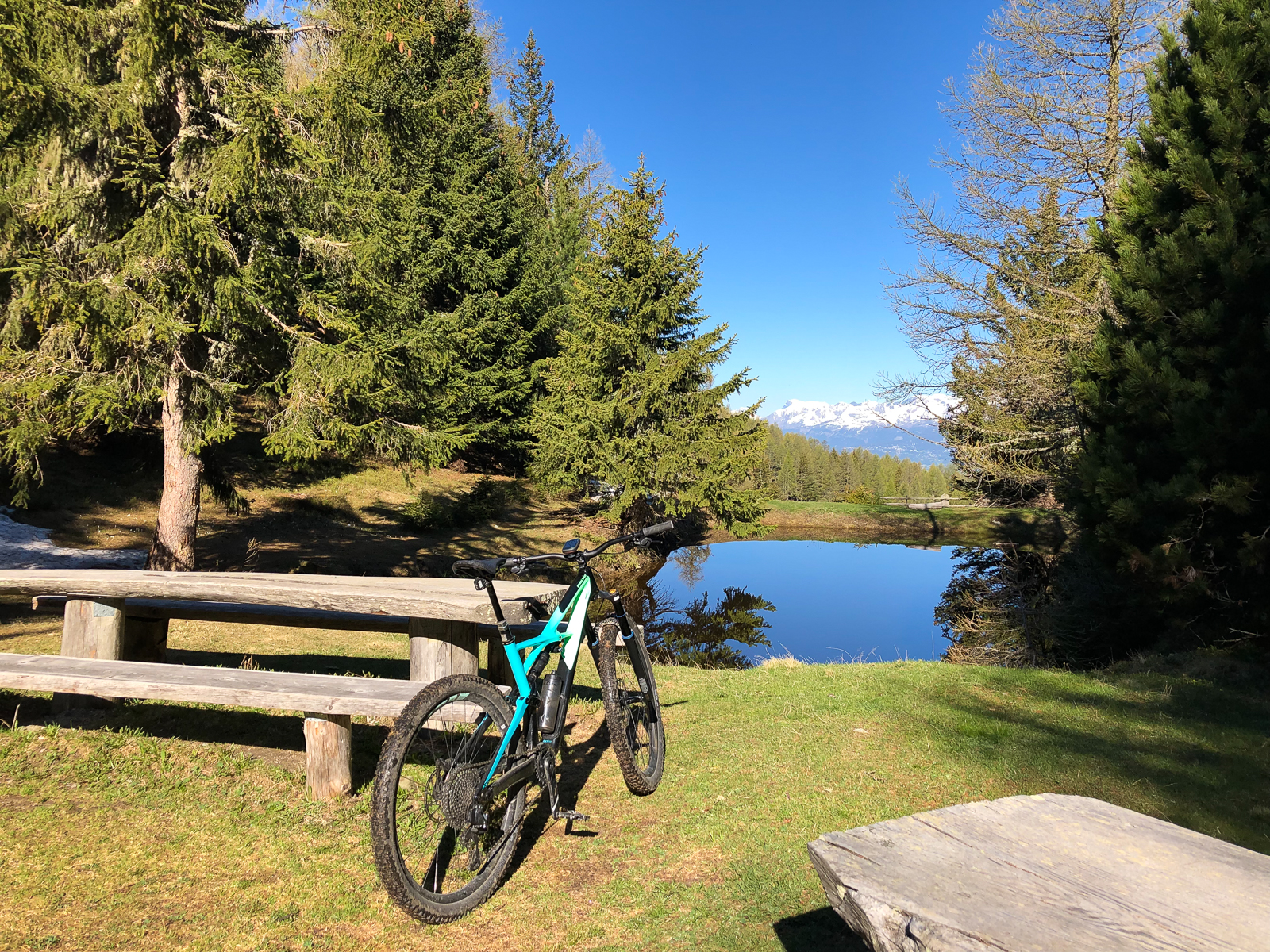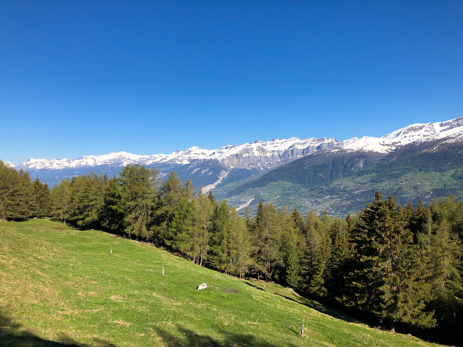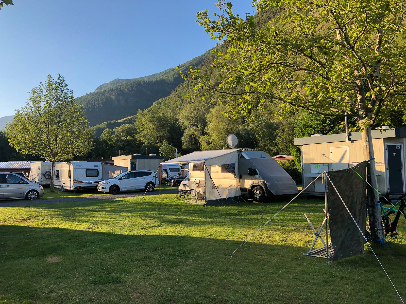 Zeitig ging es heute morgen aus den Federn. Ich wollte die Gondel kurz vor halb Acht ereichen. Direkt neben dem Campingplatz ging es dann mit der Seilbahn nach Unterbäch. Von dort startete eine rund fünfzig Kilometer lange Tour mit letztlich knapp zweitausend Höhenmetern. Diese bot Landschaftlich wie auch fahrtechnisch alles was man sich wünschen kann. Knackige Aufstiege auf befestigten Strassen, aber auch spannende und steile Abfahrten auf Singletrails und über saftige Wiesen.