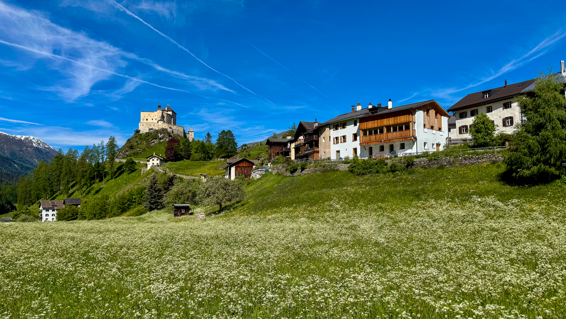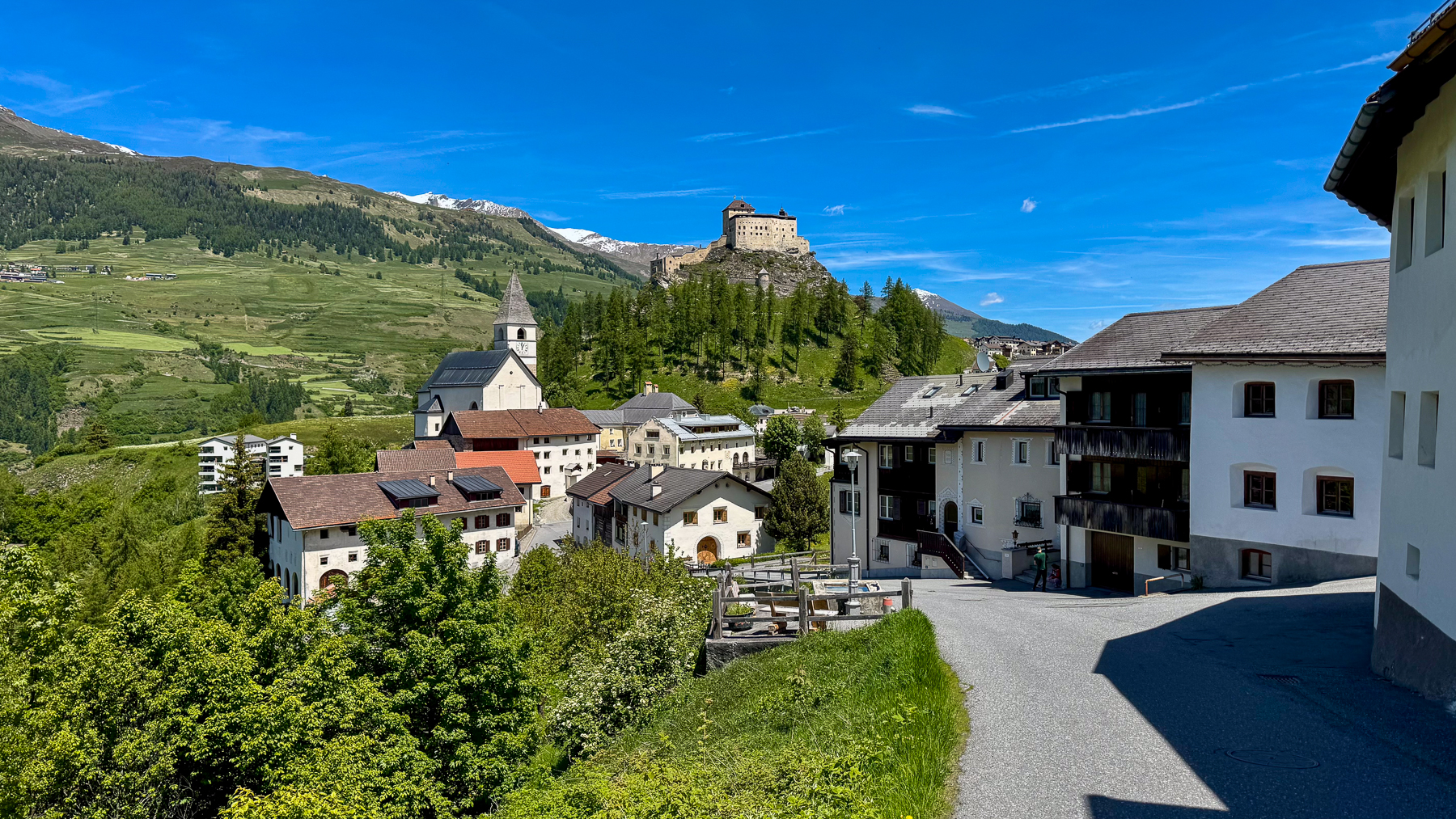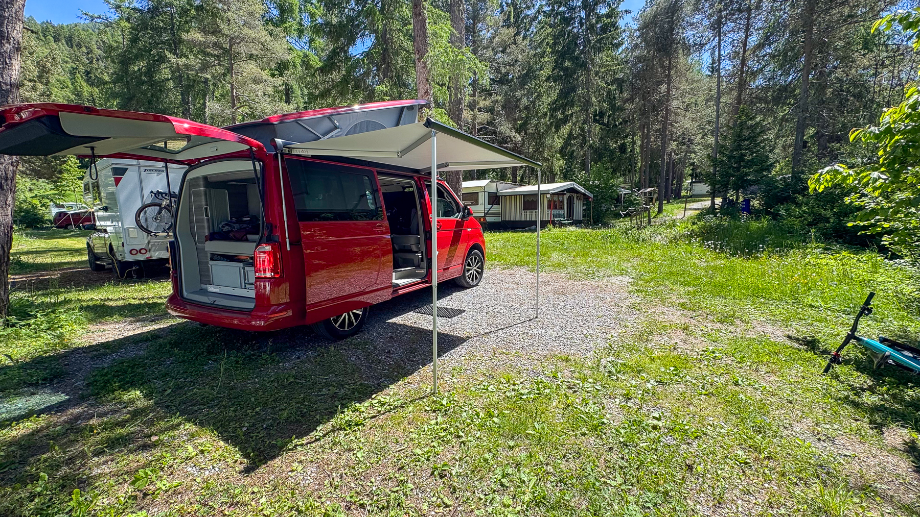 Meine Ferien beginnen in Scuol mit einer Fahrt über den Flüelapass. Bis Sonntag werde ich diese Gegend hier mit dem Mountainbike erkunden und logiere dabei im komfortablen Campingplatz TCS Scuol. Meine Platznummer ist die 1 und liegt mit unverbaubarer Sicht leicht erhöht über anderen Plätzen.